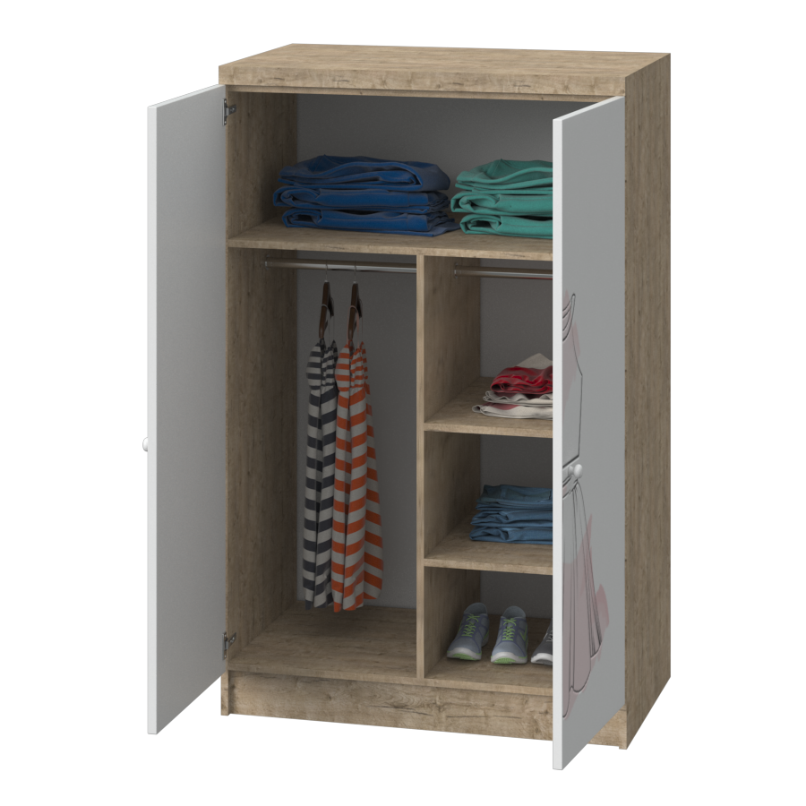 - всередині шафа розділена на штанги (короткий одяг) та полиці;