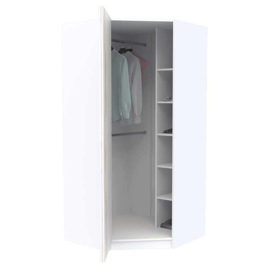 внутри шкаф разделен на штанги (короткая одежда) и полки;