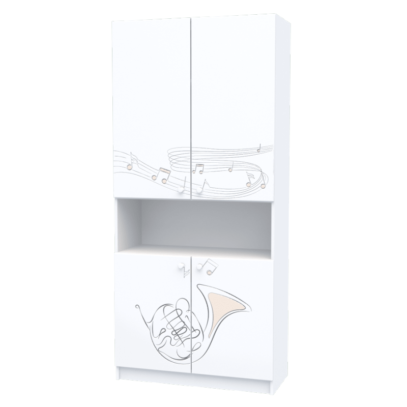 Корпус: ДСП Swisspan, біла гладка Еліт; Фасад: МДФ мальований, малюнок трафаретний з фрезерованим патинуванням.