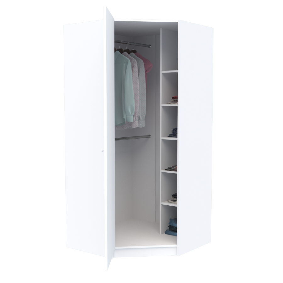 всередині шафа розділена на штанги (короткий одяг) та полиці;