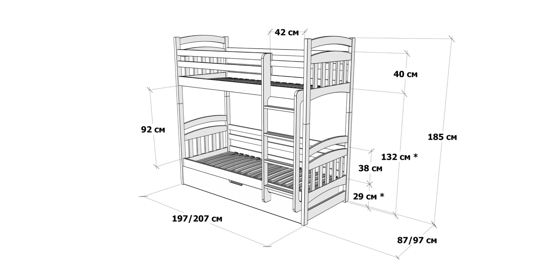 Висота від підлоги до спального місця - нижній ярус - 29 см; верхній - 132 см