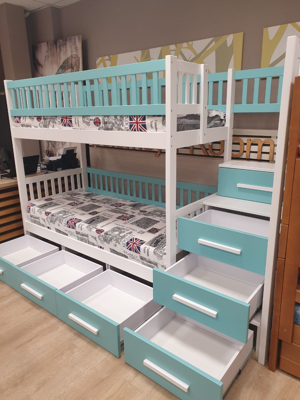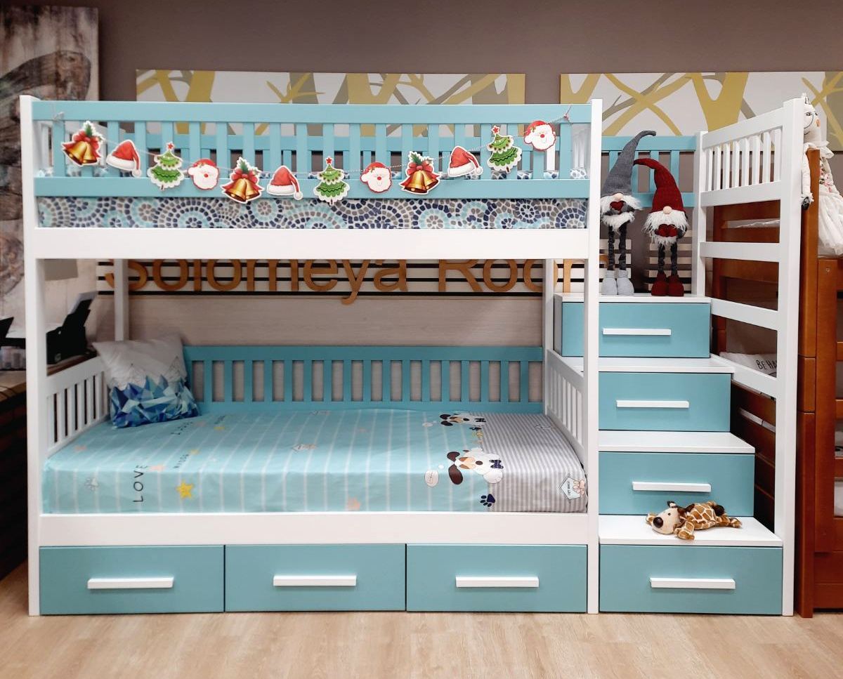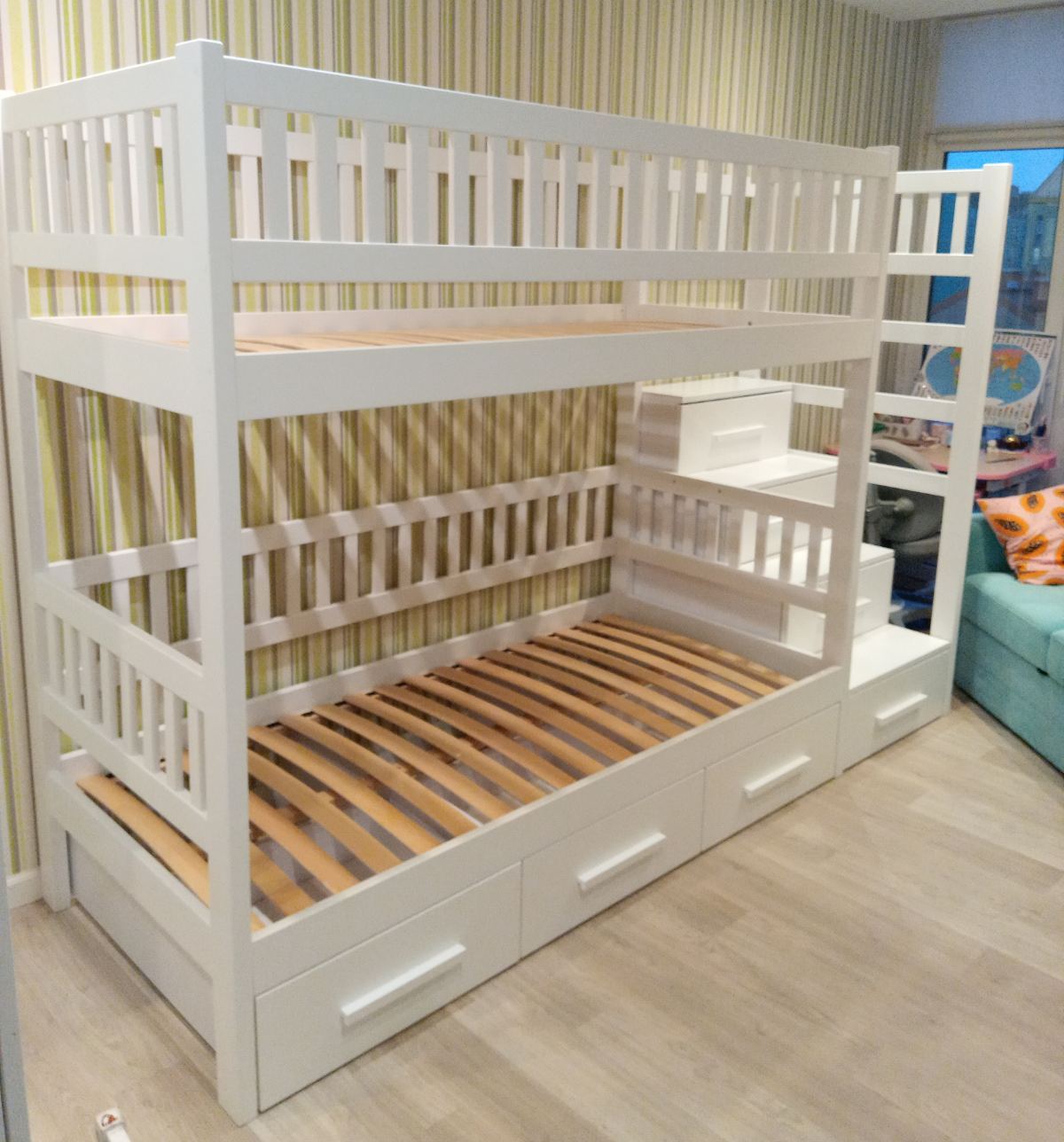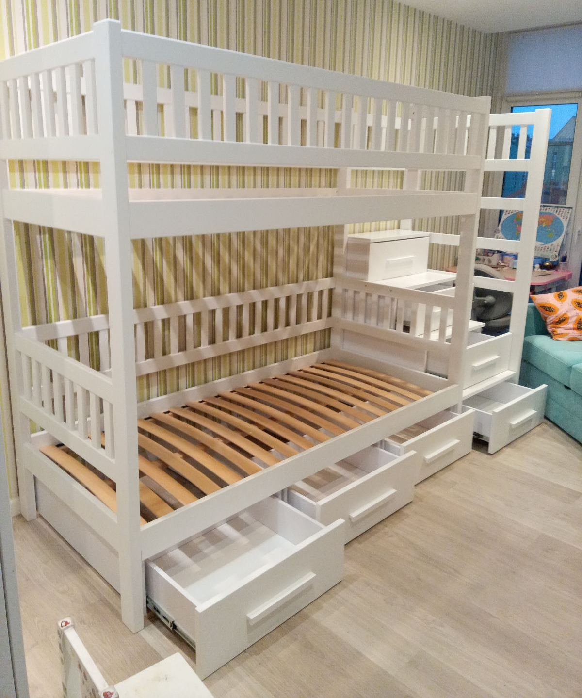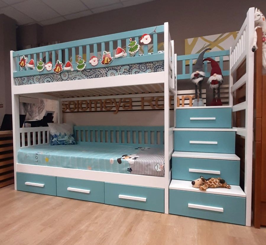- Високий бортик на другому ярусі та можливість виготовлення захисного бортика на нижній ярус, роблять ліжко безпечним для маленьких дітей.