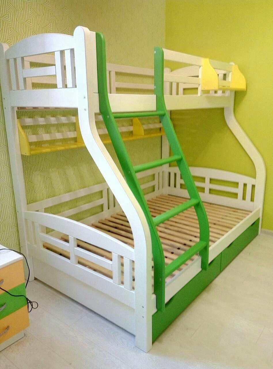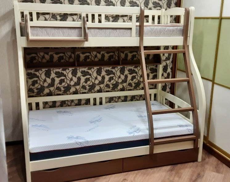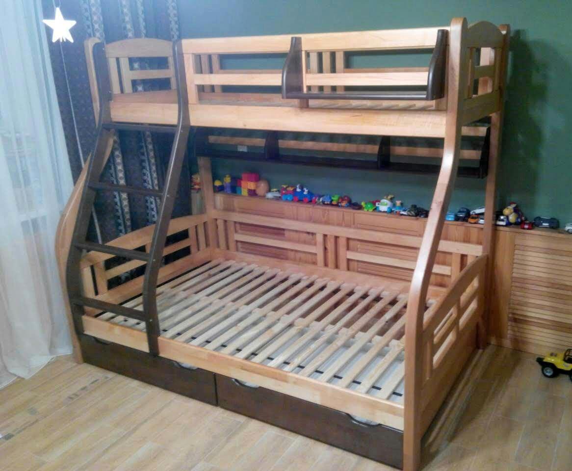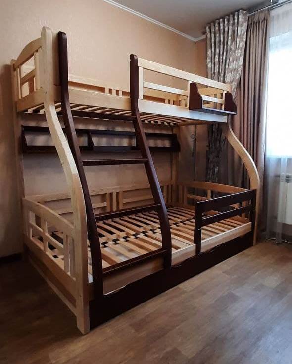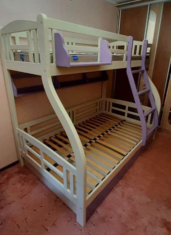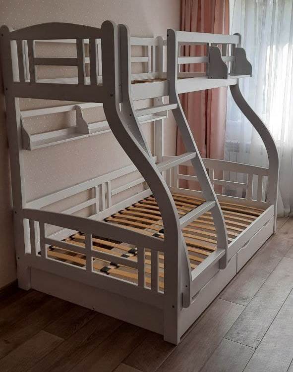 У цьому ліжку продумано все до дрібниць! Головна перевага – це збільшене нижнє спальне місце із зручним бортиком біля стіни. Основа ліжка – міцний настил із дерев'яних брусів – витримує великі навантаження і є правильним жорстким каркасом для ортопедичного матраца. На це ліжко дуже зручно сісти – нічого не заважає зверху. Полиці, розташовані на задній стінці та зовні ліжка, і висувні ящики входять до стандартної комплектації. Всі частини ліжка, що виступають, дбайливо закруглені.