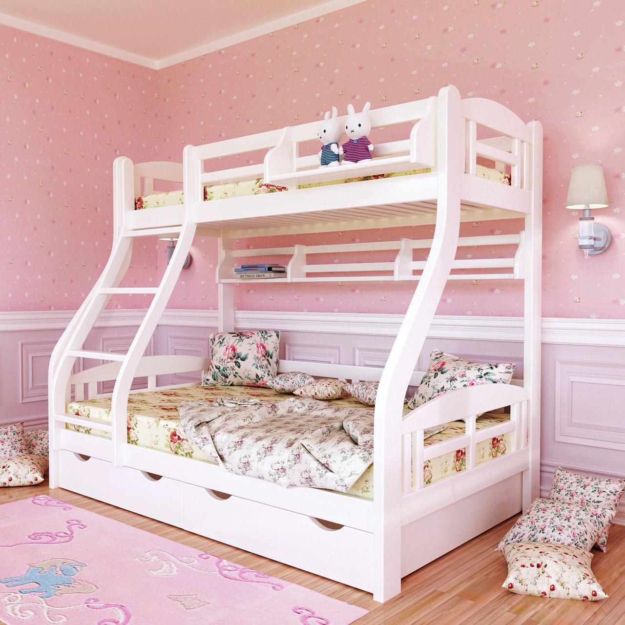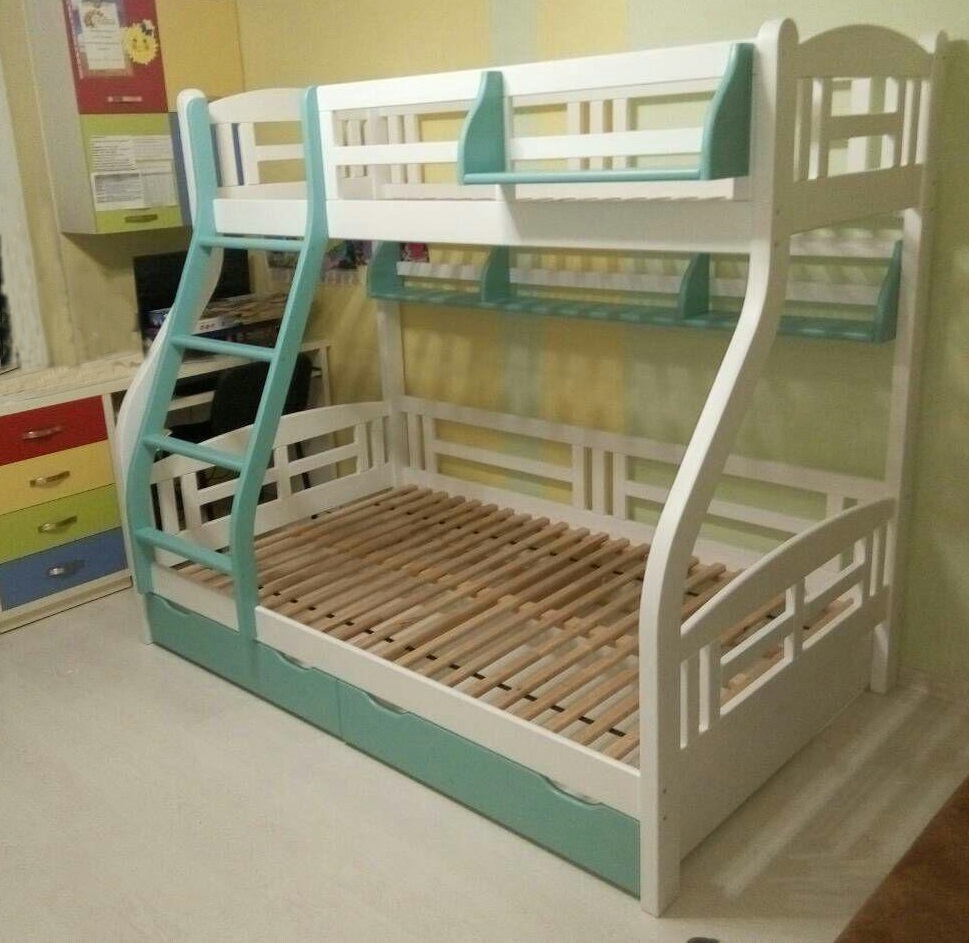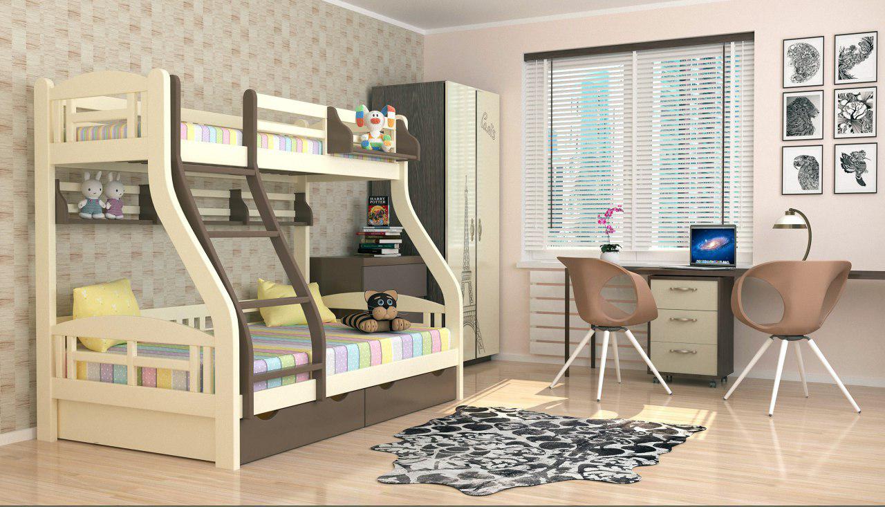 У цьому ліжку продумано все до дрібниць! Головна перевага – це збільшене нижнє спальне місце із зручним бортиком біля стіни. Основа ліжка – міцний настил із дерев'яних брусів – витримує великі навантаження і є правильним жорстким каркасом для ортопедичного матраца. На це ліжко дуже зручно сісти – нічого не заважає зверху. Полиці, розташовані на задній стінці та зовні ліжка, і висувні ящики входять до стандартної комплектації. Всі частини ліжка, що виступають, дбайливо закруглені.