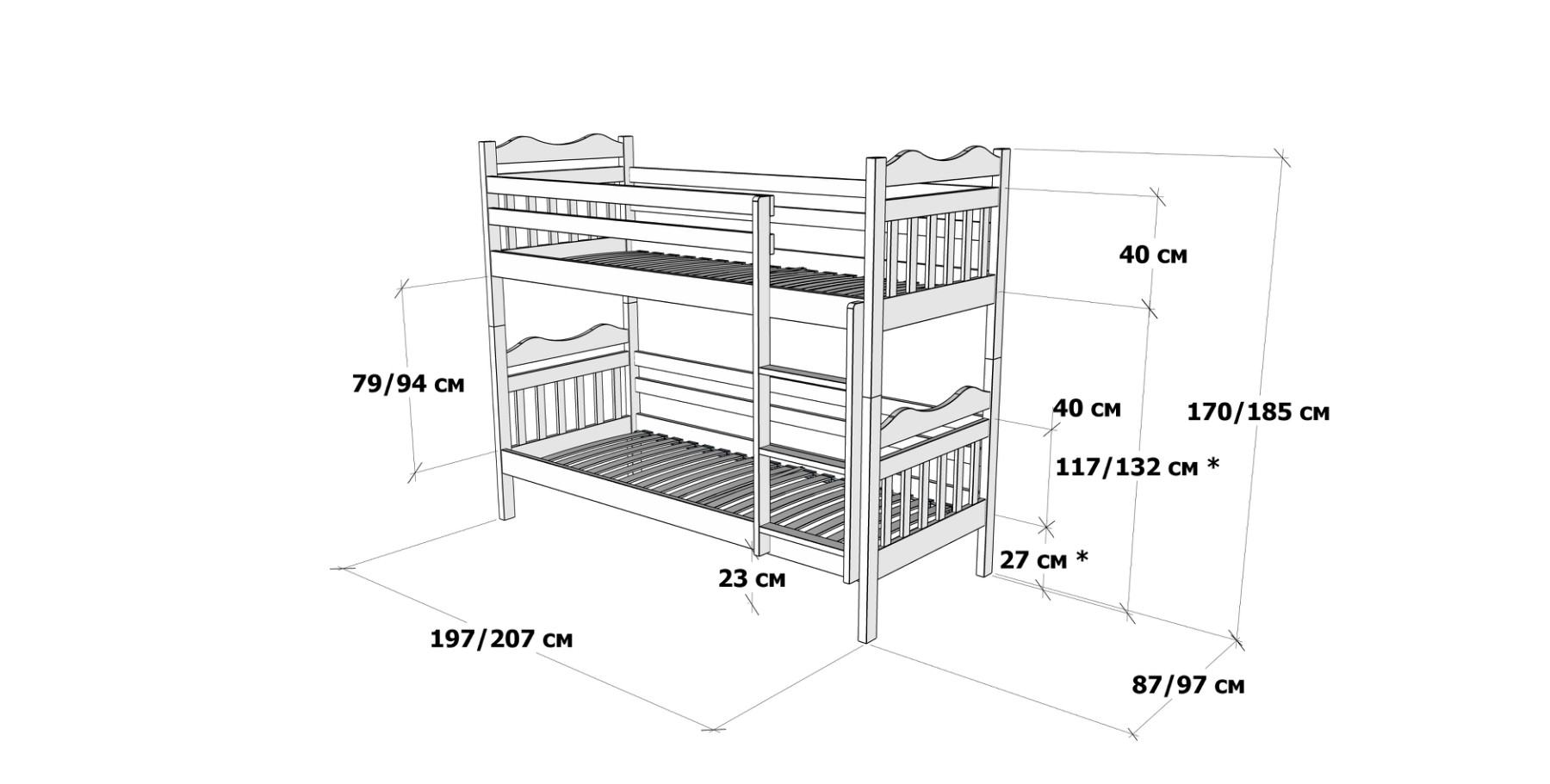 Висота від підлоги до спального місця - нижнього - 27 см; верхнього - 117 см (зі збільшеною висотою - 132 см)
