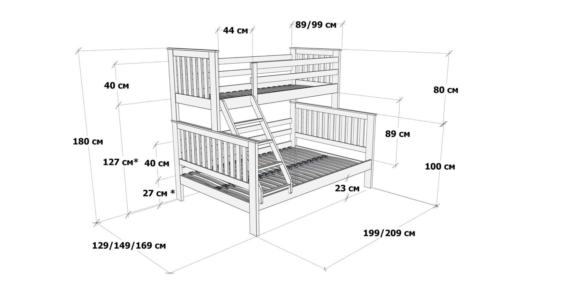 Висота від підлоги до спального місця - нижнього - 27 см; верхнього - 127 см
