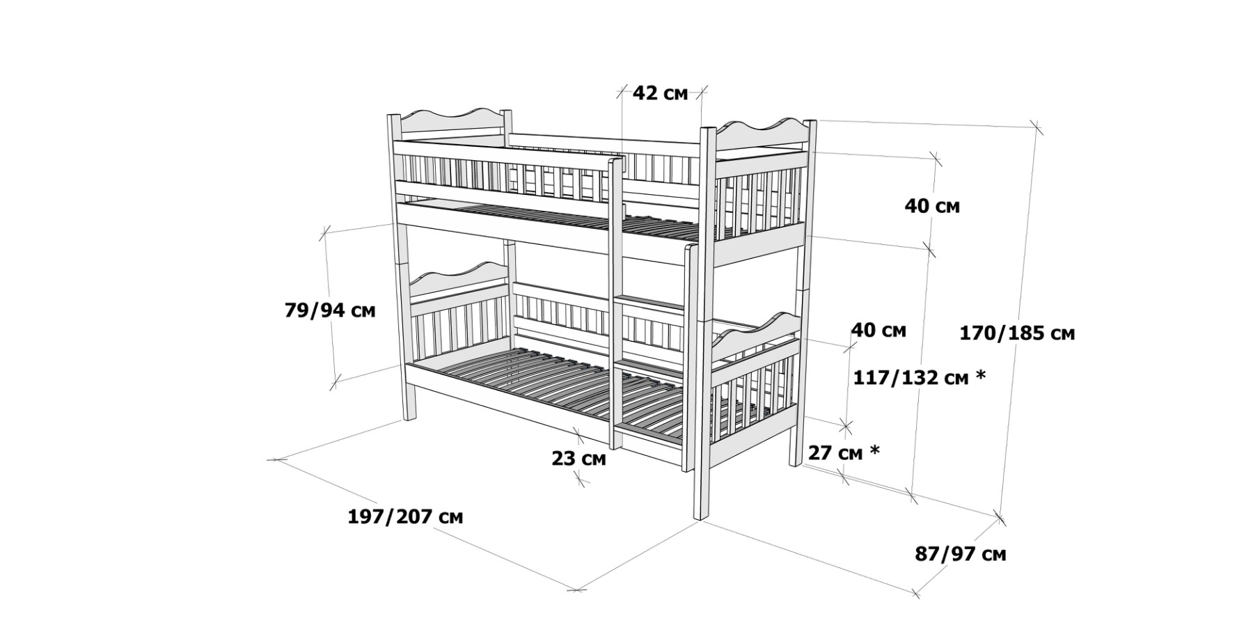 Висота від підлоги до спального місця - нижнього - 27 см; верхнього - 117 см (зі збільшеною висотою - 132 см)