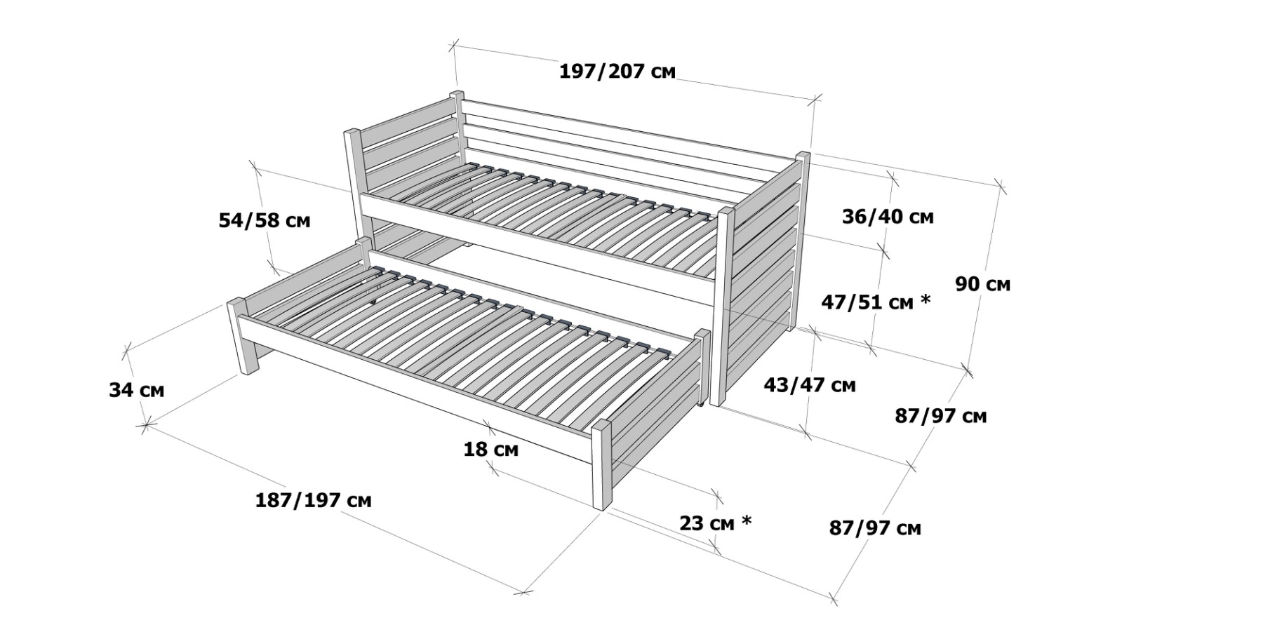 Габарит ліжка - 87 або 97*197/207 см