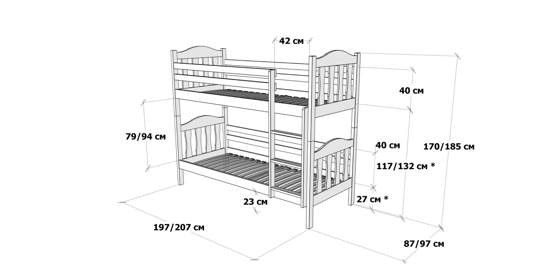 Висота від підлоги до спального місця - нижнього - 27 см; верхнього - 117 см (зі збільшеною висотою - 132 см)
