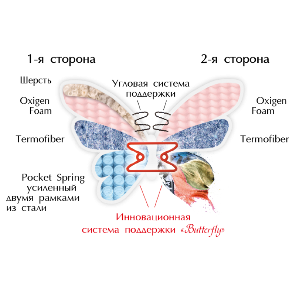 З першого боку у верхньому шарі використовується піна Oxigen Foam. Нижче розташована термоповсть - це дуже міцний матеріал, з цікавою властивістю підтримувати в матраці оптимальну температуру. З іншого боку, між піною і терморегулюючим повстю, є прошарок кокосової койри. Завдяки цьому друга сторона стає трохи жорсткішою.