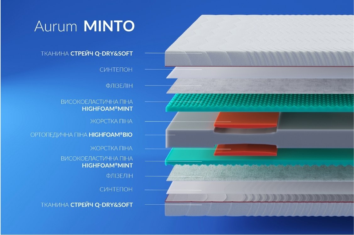 Матрац Highfoam Noble Aurum Minto (аурум мінто) - ексклюзивний мульти-зональний, що володіє яскраво вираженими ортопедичними властивостями. Високоеластичний Highfoam Mint створений на основі натуральної м'яти перцевої - сприяє зняттю емоційної напруги, що значно покращує якість сну. Точкове зонування матраца дозволяє максимально ефективно розподіляти навантаження і забезпечує комфортну підтримку поперекового і шийного відділів.
