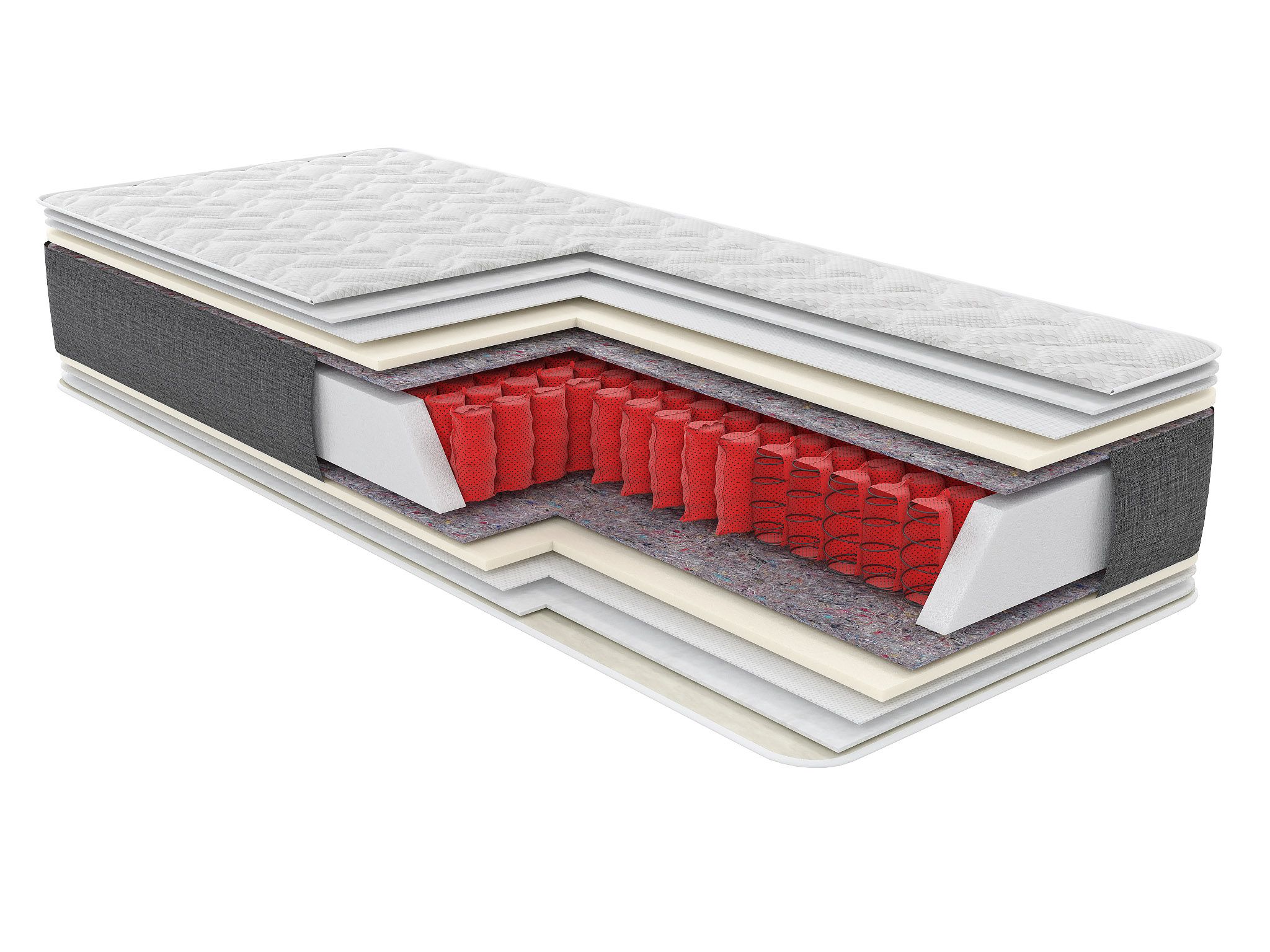 В основі цього двостороннього матраца лежить пружинний блок Покет заввишки 18 см. У ньому використані такі настильні шари: спонфлекс, повсть, флізелін та синтепон, які разом із пружинним блоком створюють висоту 24 см та середній рівень жорсткості. Виріб витримує навантаження до 140 кг на спальне місце, забезпечує ортопедичну та анатомічну підтримку.